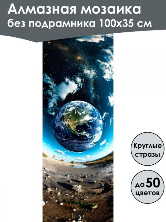 Алмазная мозаика 100×35 см собственного производства без подрамника. В картине используется до 50 оттенков для глубины цвета и плавных переходов. Надёжный клеевой слой не сохнет месяцами, стразы (26 граней) яркие, высокого качества и не отлетают. В наборе присутствуют дополнительно ZIP пакеты, номера и инструменты, для удобства работы со стразами. Картина защищена непрозрачной бумагой. Схема напечатана водными пигментными чернилами (без свинца и запаха) в светлых пастельных тонах для комфортной работы. Плотный полухлопковый холст легко разглаживается и не мнётся. Доставляется в бурой коробке. После сборки мозаика выглядит яркой и эстетичной. Узкие края предназначены для оформления в багет или обычную рамку. На изображении представлена сферическая панорама с планетой Земля в центре, окружённая глубокими космическими просторами со звёздами и облаками; внизу показан каменистый пейзаж с голубым небом на горизонте, создающий эффект перевернутого мира.