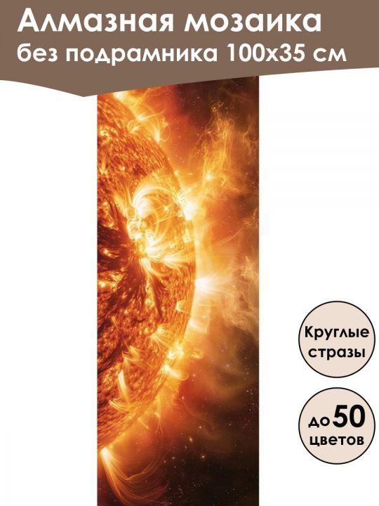 Алмазная мозаика 100×35 см собственного производства без подрамника. В картине используется до 50 оттенков для глубины цвета и плавных переходов. Надёжный клеевой слой не сохнет месяцами, стразы (26 граней) яркие, высокого качества и не отлетают. В наборе присутствуют дополнительно ZIP пакеты, номера и инструменты, для удобства работы со стразами. Картина защищена непрозрачной бумагой. Схема напечатана водными пигментными чернилами (без свинца и запаха) в светлых пастельных тонах для комфортной работы. Плотный полухлопковый холст легко разглаживается и не мнётся. Доставляется в бурой коробке. После сборки мозаика выглядит яркой и эстетичной. Узкие края предназначены для оформления в багет или обычную рамку. На изображении показана часть поверхности Солнца, окрашенная в яркие оранжево-жёлтые тона, с видимыми динамическими потоками плазмы и солнечными вспышками, которые создают впечатляющее зрелище активной звезды на фоне тёмного космоса.