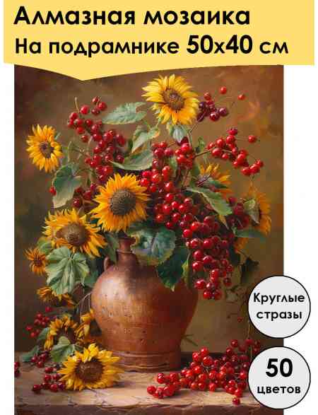 Алмазная мозаика на подрамнике «Подсолнухи и калина» 50x40 см, 50 цветов