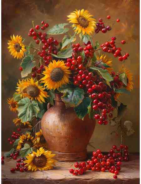 Алмазная мозаика без подрамника «Подсолнухи и калина» 70x50 см, 46 цветов