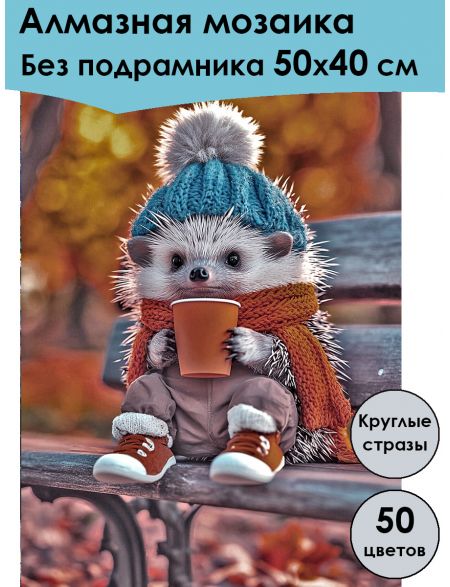 Алмазная мозаика без подрамника «Ёжик и кофе» 50x40 см, 50 цветов