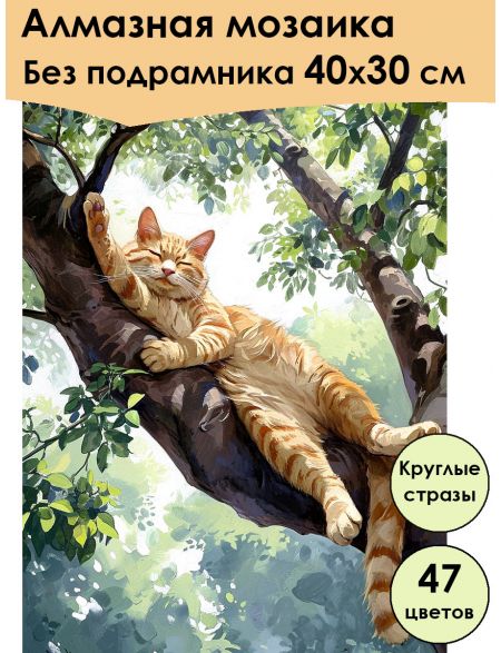 Алмазная мозаика без подрамника «Котик на ветке» 40x30 см, 47 цветов