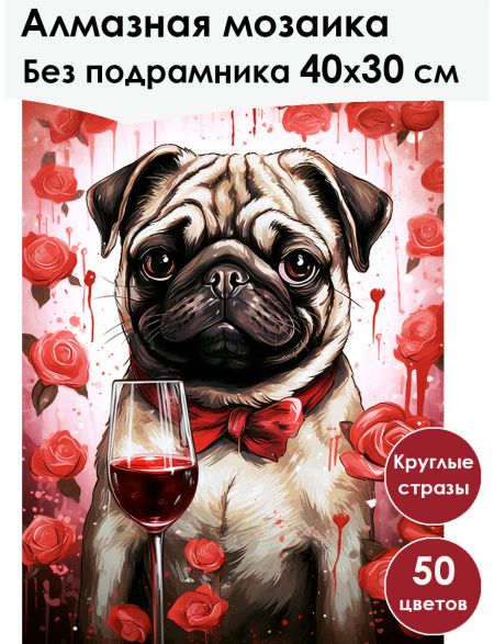 Алмазная мозаика без подрамника «Мопс» 40x30 см, 50 цветов