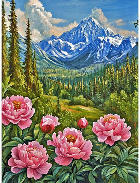 Алмазная мозаика без подрамника «Долина пионов» 130x100 см, 50 цветов