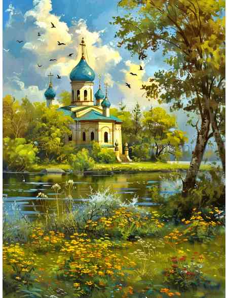 Алмазная мозаика без подрамника «Церковь у воды» 35x25 см
