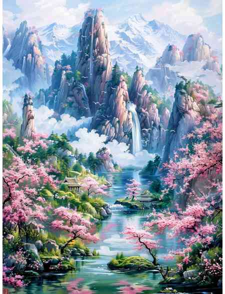 Алмазная мозаика без подрамника «Сакура в горах» 40x30 см