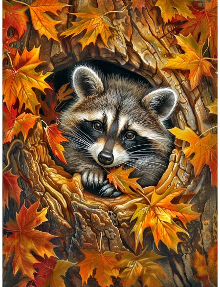 Алмазная мозаика без подрамника «Енот и осень» 90x70 см, 45 цветов