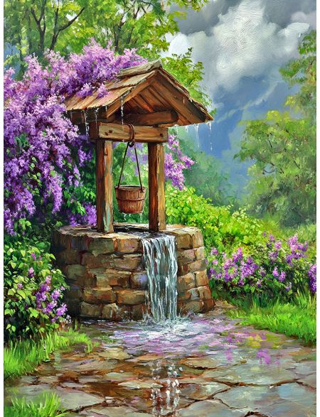 Алмазная мозаика без подрамника «Колодец в саду» 50x40 см