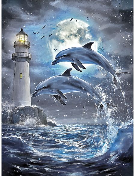 Алмазная мозаика без подрамника «Дельфин и маяк» 130x100 см, 50 цветов