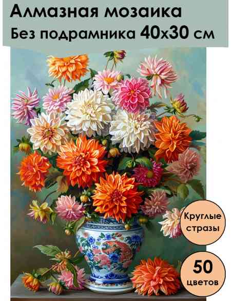 Алмазная мозаика без подрамника «Георгины» 40x30 см, 50 цветов