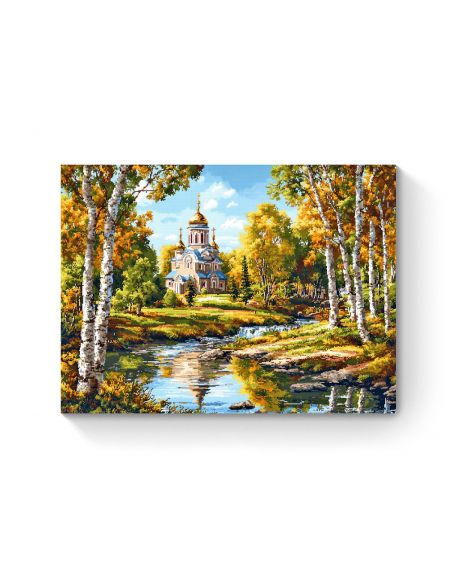 Алмазная мозаика на подрамнике «Храм у реки» 50x40 см, 50 цветов