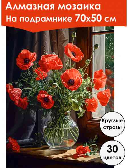 Алмазная мозаика на подрамнике «Букет из маков» 70x50 см, 30 цветов