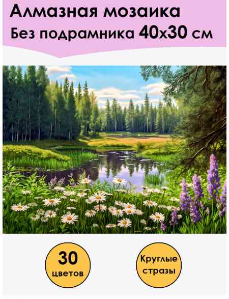 Алмазная мозаика без подрамника «Луговые цветы» 40x30 см, 30 цветов