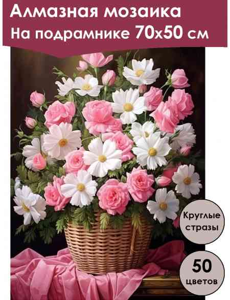Алмазная мозаика на подрамнике «Корзинка цветов» 70x50 см, 50 цветов