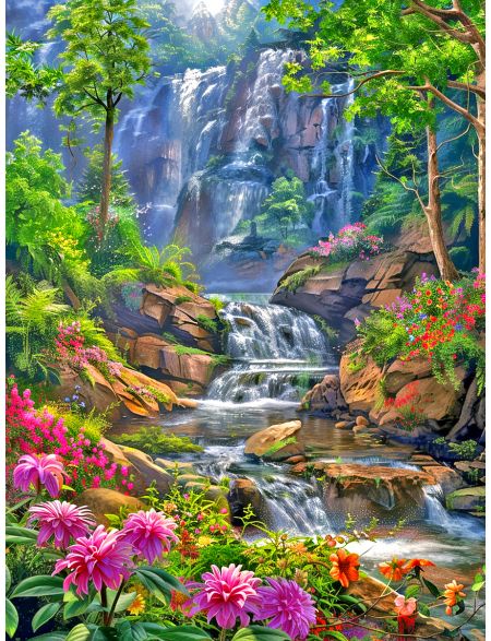 Алмазная мозаика без подрамника «Водопад и цветы» 130x100 см, 50 цветов