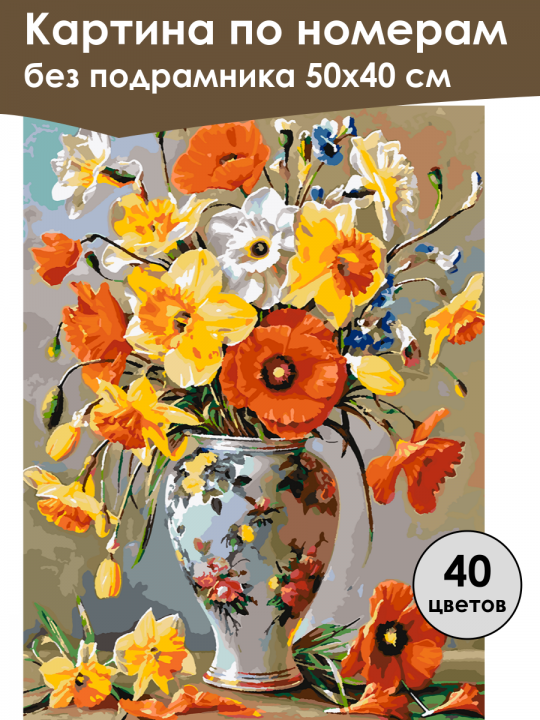 Картина по номерам без подрамника, размер 50х40 см, произведена нами. Она включает 40 оттенков и 3123 контуров, что придаёт ей глубину цвета и плавные переходы. Картина выглядит более ярко и живо. В комплект входит глянцевый лак, которым можно покрыть работу по желанию. Краски имеют хорошую укрывистость, хватает двух проходов что бы закрасить символы на схеме. Так же они сохраняют текстуру мазков, не растекаясь и не разглаживаясь полностью на холсте. При покрытии глянцевым лаком создаётся эффект приближенный к масляной живописи. Краски упакованы герметично, что сохраняет их жидкими. Все необходимые инструменты для начала работы также входят в комплект. Мы не используем экосольвентные чернила, которые содержат свинец и могут быть вредны для здоровья. Наши картины напечатаны безопасными водными пигментными чернилами, обеспечивающими чёткое изображение и легко читаемые обозначения. Холст плотный, имеет мелкую зернистость, легко разглаживается и устойчив к сминанию. Картина поставляется в бурой коробке. Следует отметить, что картина без подрамника её нельзя натянуть на подрамник из-за узких краёв, она предназначена для оформления в рамочку. Натюрморт с пышным букетом оранжевых и жёлтых цветов, среди которых выделяются нарциссы и маки, в красивой фарфоровой вазе с цветочным узором, расположенной на деревянной поверхности, с фоновой палитрой из мягких пастельных оттенков.
