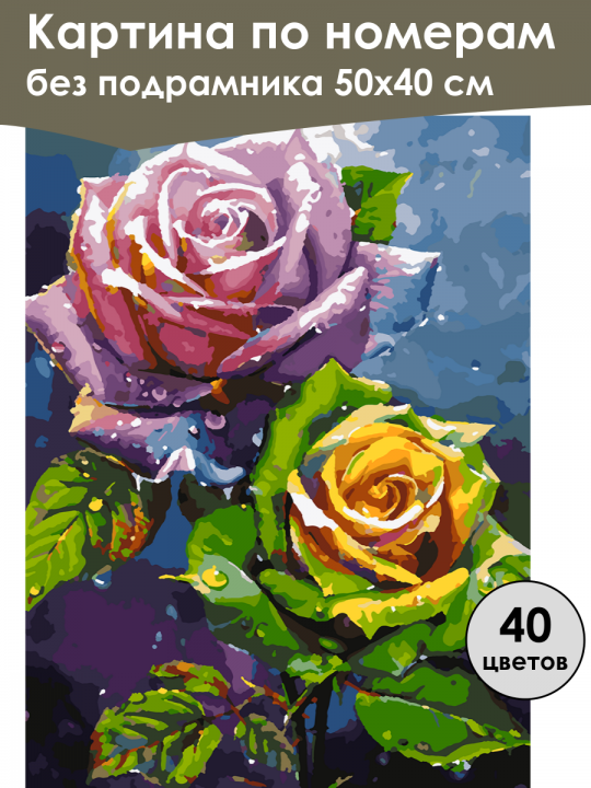 Картина по номерам без подрамника, размер 50х40 см, произведена нами. Она включает 40 оттенков и 1639 контуров, что придаёт ей глубину цвета и плавные переходы. Картина выглядит более ярко и живо. В комплект входит глянцевый лак, которым можно покрыть работу по желанию. Краски имеют хорошую укрывистость, хватает двух проходов что бы закрасить символы на схеме. Так же они сохраняют текстуру мазков, не растекаясь и не разглаживаясь полностью на холсте. При покрытии глянцевым лаком создаётся эффект приближенный к масляной живописи. Краски упакованы герметично, что сохраняет их жидкими. Все необходимые инструменты для начала работы также входят в комплект. Мы не используем экосольвентные чернила, которые содержат свинец и могут быть вредны для здоровья. Наши картины напечатаны безопасными водными пигментными чернилами, обеспечивающими чёткое изображение и легко читаемые обозначения. Холст плотный, имеет мелкую зернистость, легко разглаживается и устойчив к сминанию. Картина поставляется в бурой коробке. Следует отметить, что картина без подрамника её нельзя натянуть на подрамник из-за узких краёв, она предназначена для оформления в рамочку. Две розы в стиле цифровой живописи: верхняя роза нежно-розового цвета с каплями воды на лепестках, а нижняя — ярко-жёлтая с насыщенными зелёными листьями, фон изображён абстрактными оттенками синего и зелёного.