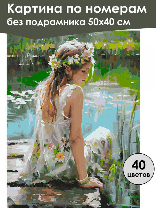 Картина по номерам без подрамника, размер 50х40 см, произведена нами. Она включает 40 оттенков и 3385 контуров, что придаёт ей глубину цвета и плавные переходы. Картина выглядит более ярко и живо. В комплект входит глянцевый лак, которым можно покрыть работу по желанию. Краски имеют хорошую укрывистость, хватает двух проходов что бы закрасить символы на схеме. Так же они сохраняют текстуру мазков, не растекаясь и не разглаживаясь полностью на холсте. При покрытии глянцевым лаком создаётся эффект приближенный к масляной живописи. Краски упакованы герметично, что сохраняет их жидкими. Все необходимые инструменты для начала работы также входят в комплект. Мы не используем экосольвентные чернила, которые содержат свинец и могут быть вредны для здоровья. Наши картины напечатаны безопасными водными пигментными чернилами, обеспечивающими чёткое изображение и легко читаемые обозначения. Холст плотный, имеет мелкую зернистость, легко разглаживается и устойчив к сминанию. Картина поставляется в бурой коробке. Следует отметить, что картина без подрамника её нельзя натянуть на подрамник из-за узких краёв, она предназначена для оформления в рамочку. Девочка, сидящая у воды на деревянном мостике; её светлые волосы украшены венком из цветов, а платье с яркими цветочными узорами гармонично сочетается с зелёно-голубыми оттенками природы вокруг.