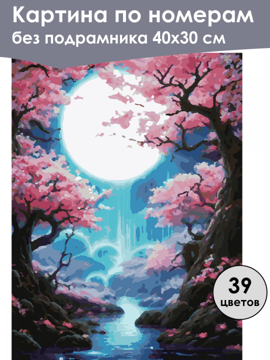 Картина по номерам без подрамника, размер 40х30 см, произведена нами. Она включает 40 оттенков и 2637 контуров, что придаёт ей глубину цвета и плавные переходы. Картина выглядит более ярко и живо. В комплект входит глянцевый лак, которым можно покрыть работу по желанию. Краски имеют хорошую укрывистость, хватает двух проходов что бы закрасить символы на схеме. Так же они сохраняют текстуру мазков, не растекаясь и не разглаживаясь полностью на холсте. При покрытии глянцевым лаком создаётся эффект приближенный к масляной живописи. Краски упакованы герметично, что сохраняет их жидкими. Все необходимые инструменты для начала работы также входят в комплект. Мы не используем экосольвентные чернила, которые содержат свинец и могут быть вредны для здоровья. Наши картины напечатаны безопасными водными пигментными чернилами, обеспечивающими чёткое изображение и легко читаемые обозначения. Холст плотный, имеет мелкую зернистость, легко разглаживается и устойчив к сминанию. Картина поставляется в бурой коробке. Следует отметить, что картина без подрамника её нельзя натянуть на подрамник из-за узких краёв, она предназначена для оформления в рамочку. Фантастический пейзаж с ярким круглым луной на фоне, окружённой розовыми деревьями, напоминающими цветущую сакуру, водопад голубого цвета изливается в реку, простирающуюся вниз через лесистую долину с туманными холмами.