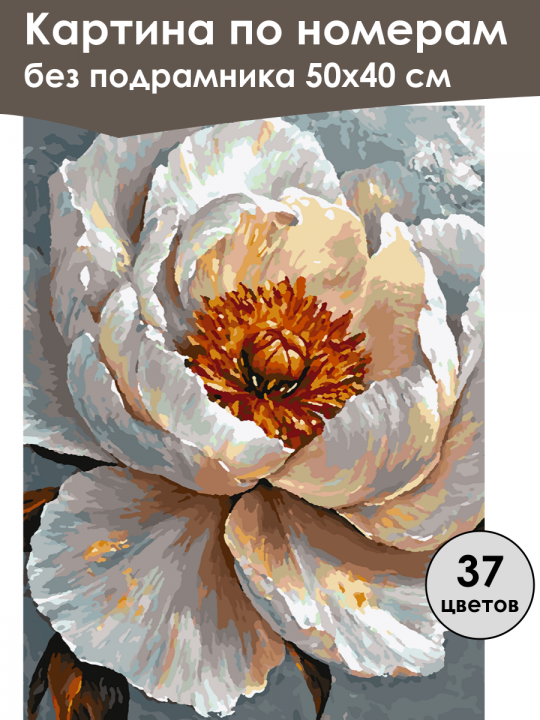 Картина по номерам без подрамника, размер 50х40 см, произведена нами. Она включает 40 оттенков и 2430 контуров, что придаёт ей глубину цвета и плавные переходы. Картина выглядит более ярко и живо. В комплект входит глянцевый лак, которым можно покрыть работу по желанию. Краски имеют хорошую укрывистость, хватает двух проходов что бы закрасить символы на схеме. Так же они сохраняют текстуру мазков, не растекаясь и не разглаживаясь полностью на холсте. При покрытии глянцевым лаком создаётся эффект приближенный к масляной живописи. Краски упакованы герметично, что сохраняет их жидкими. Все необходимые инструменты для начала работы также входят в комплект. Мы не используем экосольвентные чернила, которые содержат свинец и могут быть вредны для здоровья. Наши картины напечатаны безопасными водными пигментными чернилами, обеспечивающими чёткое изображение и легко читаемые обозначения. Холст плотный, имеет мелкую зернистость, легко разглаживается и устойчив к сминанию. Картина поставляется в бурой коробке. Следует отметить, что картина без подрамника её нельзя натянуть на подрамник из-за узких краёв, она предназначена для оформления в рамочку. Цветок белого пиона, крупным планом, с большими лепестками, выполненный в стиле живописи с использованием оттенков белого, кремового и коричневого. Центральная часть цветка насыщена оранжевыми и коричневыми тонами, что придаёт ему яркость и глубину, а текстура мазков подчёркивает динамику и объём изображения.