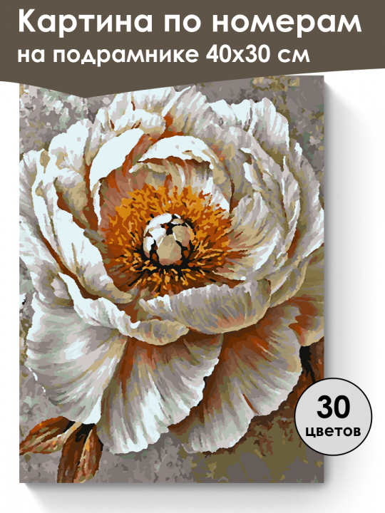 Картина по номерам на подрамнике, размер 40х30 см, произведена нами. Она включает 40 оттенков и 2641 контуров, что придаёт ей глубину цвета и плавные переходы. Картина выглядит более ярко и живо. В комплект входит глянцевый лак, которым можно покрыть работу по желанию. Краски имеют хорошую укрывистость, хватает двух проходов что бы закрасить символы на схеме. Так же они сохраняют текстуру мазков, не растекаясь и не разглаживаясь полностью на холсте. При покрытии глянцевым лаком создаётся эффект приближенный к масляной живописи. Краски упакованы герметично, что сохраняет их жидкими. Все необходимые инструменты для начала работы также включены в комплект, в том числе и крепления на стену. В картине используется крепкий подрамник со специальной вставкой, которая предотвращает провисание холста во время рисования. Это обеспечивает комфортный процесс работы и гарантирует, что холст всегда будет оставаться хорошо натянутым. Мы не используем экосольвентные чернила, которые содержат свинец и могут быть вредны для здоровья. Наши картины напечатаны безопасными водными пигментными чернилами, обеспечивающими чёткое изображение и легко читаемые обозначения. Холст плотный, имеет мелкую зернистость, легко разглаживается и устойчив к сминанию. Картина поставляется в защищённой бурой коробке. Изображение красочного рисунка крупного цветка пиона, с белыми и оранжевыми лепестками, где центр открыт и подчёркнут тёмными и светлыми оттенками, создавая живописную текстуру и объёмный вид, на фоне из размытых нейтральных тонов, что добавляет общей композиции глубину и выразительность.
