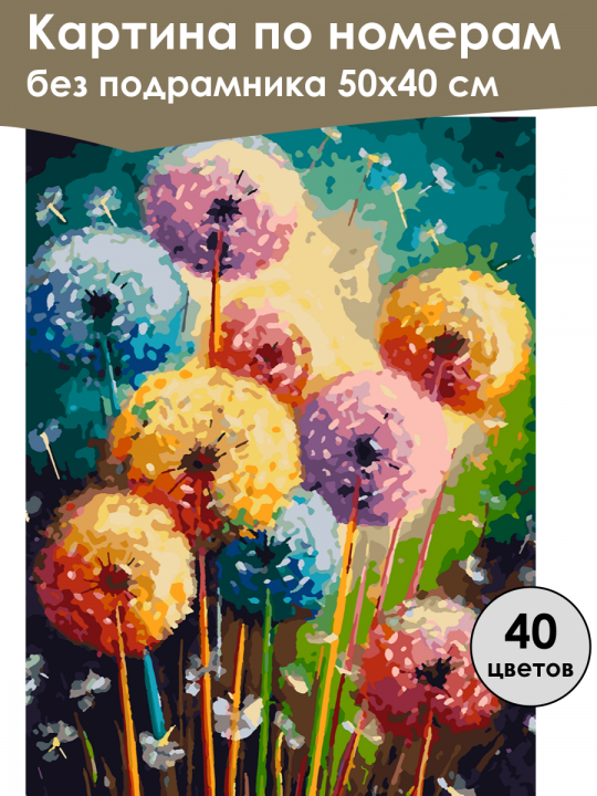 Картина по номерам без подрамника, размер 50х40 см, произведена нами. Она включает 40 оттенков и 2019 контуров, что придаёт ей глубину цвета и плавные переходы. Картина выглядит более ярко и живо. В комплект входит глянцевый лак, которым можно покрыть работу по желанию. Краски имеют хорошую укрывистость, хватает двух проходов что бы закрасить символы на схеме. Так же они сохраняют текстуру мазков, не растекаясь и не разглаживаясь полностью на холсте. При покрытии глянцевым лаком создаётся эффект приближенный к масляной живописи. Краски упакованы герметично, что сохраняет их жидкими. Все необходимые инструменты для начала работы также входят в комплект. Мы не используем экосольвентные чернила, которые содержат свинец и могут быть вредны для здоровья. Наши картины напечатаны безопасными водными пигментными чернилами, обеспечивающими чёткое изображение и легко читаемые обозначения. Холст плотный, имеет мелкую зернистость, легко разглаживается и устойчив к сминанию. Картина поставляется в бурой коробке. Следует отметить, что картина без подрамника её нельзя натянуть на подрамник из-за узких краёв, она предназначена для оформления в рамочку. Абстрактная композиция в стиле пуантилизма с разноцветными одуванчиками на стеблях, выполненная в ярких акварельных тонах, на фоне тёмно-зелёного и голубого цвета, создавая впечатление ночного пейзажа с дуновением ветра.