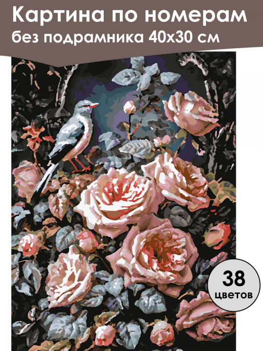 Картина по номерам без подрамника, размер 40х30 см, произведена нами. Она включает 40 оттенков и 3448 контуров, что придаёт ей глубину цвета и плавные переходы. Картина выглядит более ярко и живо. В комплект входит глянцевый лак, которым можно покрыть работу по желанию. Краски имеют хорошую укрывистость, хватает двух проходов что бы закрасить символы на схеме. Так же они сохраняют текстуру мазков, не растекаясь и не разглаживаясь полностью на холсте. При покрытии глянцевым лаком создаётся эффект приближенный к масляной живописи. Краски упакованы герметично, что сохраняет их жидкими. Все необходимые инструменты для начала работы также входят в комплект. Мы не используем экосольвентные чернила, которые содержат свинец и могут быть вредны для здоровья. Наши картины напечатаны безопасными водными пигментными чернилами, обеспечивающими чёткое изображение и легко читаемые обозначения. Холст плотный, имеет мелкую зернистость, легко разглаживается и устойчив к сминанию. Картина поставляется в бурой коробке. Следует отметить, что картина без подрамника её нельзя натянуть на подрамник из-за узких краёв, она предназначена для оформления в рамочку. Птица соловей, сидящая среди большого количества розовых роз с насыщенными зелёными листьями, в мягких оттенках, создавая сказочную и романтическую атмосферу на тёмно-синем фоне.