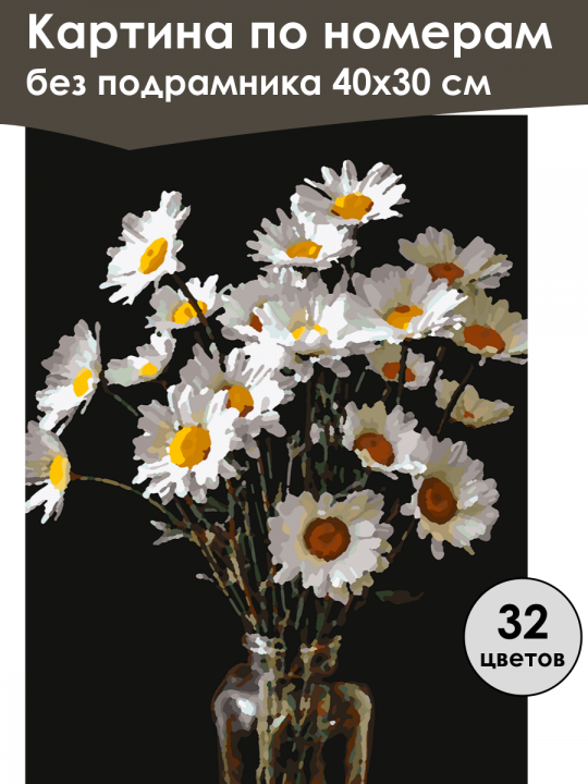 Картина по номерам без подрамника, размер 40х30 см, произведена нами. Она включает 40 оттенков и 1512 контуров, что придаёт ей глубину цвета и плавные переходы. Картина выглядит более ярко и живо. В комплект входит глянцевый лак, которым можно покрыть работу по желанию. Краски имеют хорошую укрывистость, хватает двух проходов что бы закрасить символы на схеме. Так же они сохраняют текстуру мазков, не растекаясь и не разглаживаясь полностью на холсте. При покрытии глянцевым лаком создаётся эффект приближенный к масляной живописи. Краски упакованы герметично, что сохраняет их жидкими. Все необходимые инструменты для начала работы также входят в комплект. Мы не используем экосольвентные чернила, которые содержат свинец и могут быть вредны для здоровья. Наши картины напечатаны безопасными водными пигментными чернилами, обеспечивающими чёткое изображение и легко читаемые обозначения. Холст плотный, имеет мелкую зернистость, легко разглаживается и устойчив к сминанию. Картина поставляется в бурой коробке. Следует отметить, что картина без подрамника её нельзя натянуть на подрамник из-за узких краёв, она предназначена для оформления в рамочку. Букет ромашек в стеклянной вазе на тёмном фоне, цветы имеют белые лепестки и жёлтые сердцевины, колышутся на длинных стеблях, создавая ощущение лёгкости и свежести.