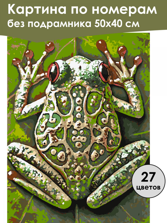 Картина по номерам без подрамника, размер 50х40 см, произведена нами. Она включает 40 оттенков и 3364 контуров, что придаёт ей глубину цвета и плавные переходы. Картина выглядит более ярко и живо. В комплект входит глянцевый лак, которым можно покрыть работу по желанию. Краски имеют хорошую укрывистость, хватает двух проходов что бы закрасить символы на схеме. Так же они сохраняют текстуру мазков, не растекаясь и не разглаживаясь полностью на холсте. При покрытии глянцевым лаком создаётся эффект приближенный к масляной живописи. Краски упакованы герметично, что сохраняет их жидкими. Все необходимые инструменты для начала работы также входят в комплект. Мы не используем экосольвентные чернила, которые содержат свинец и могут быть вредны для здоровья. Наши картины напечатаны безопасными водными пигментными чернилами, обеспечивающими чёткое изображение и легко читаемые обозначения. Холст плотный, имеет мелкую зернистость, легко разглаживается и устойчив к сминанию. Картина поставляется в бурой коробке. Следует отметить, что картина без подрамника её нельзя натянуть на подрамник из-за узких краёв, она предназначена для оформления в рамочку. Лягушка, выполненная в стиле цифрового искусства, с выраженными красными глазами и пятнистым окрасом, сидящая на зелёном листе.