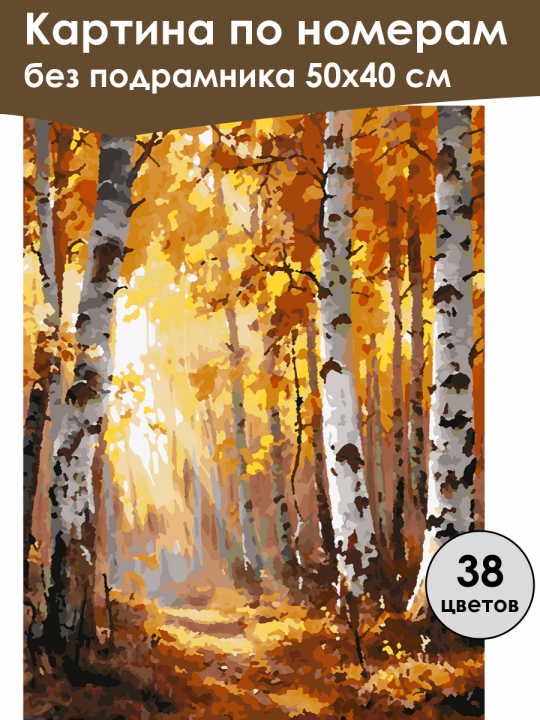 Картина по номерам без подрамника, размер 50х40 см, произведена нами. Она включает 40 оттенков и 3877 контуров, что придаёт ей глубину цвета и плавные переходы. Картина выглядит более ярко и живо. В комплект входит глянцевый лак, которым можно покрыть работу по желанию. Краски имеют хорошую укрывистость, хватает двух проходов что бы закрасить символы на схеме. Так же они сохраняют текстуру мазков, не растекаясь и не разглаживаясь полностью на холсте. При покрытии глянцевым лаком создаётся эффект приближенный к масляной живописи. Краски упакованы герметично, что сохраняет их жидкими. Все необходимые инструменты для начала работы также входят в комплект. Мы не используем экосольвентные чернила, которые содержат свинец и могут быть вредны для здоровья. Наши картины напечатаны безопасными водными пигментными чернилами, обеспечивающими чёткое изображение и легко читаемые обозначения. Холст плотный, имеет мелкую зернистость, легко разглаживается и устойчив к сминанию. Картина поставляется в бурой коробке. Следует отметить, что картина без подрамника её нельзя натянуть на подрамник из-за узких краёв, она предназначена для оформления в рамочку. Абстрактное изображение берёзовой рощи в осеннем лесу; стволы деревьев выделяются тёмными и светлыми полосами, а листвой царят насыщенные оттенки жёлтого, оранжевого и коричневого, создавая атмосферу тёплого солнечного света, который проникает сквозь кроны, освещая лесную тропу и подчёркивая контрастность природной палитры.