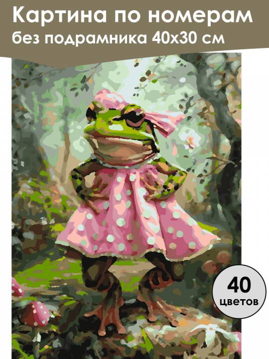 Картина по номерам без подрамника, размер 40х30 см, произведена нами. Она включает 40 оттенков и 2496 контуров, что придаёт ей глубину цвета и плавные переходы. Картина выглядит более ярко и живо. В комплект входит глянцевый лак, которым можно покрыть работу по желанию. Краски имеют хорошую укрывистость, хватает двух проходов что бы закрасить символы на схеме. Так же они сохраняют текстуру мазков, не растекаясь и не разглаживаясь полностью на холсте. При покрытии глянцевым лаком создаётся эффект приближенный к масляной живописи. Краски упакованы герметично, что сохраняет их жидкими. Все необходимые инструменты для начала работы также входят в комплект. Мы не используем экосольвентные чернила, которые содержат свинец и могут быть вредны для здоровья. Наши картины напечатаны безопасными водными пигментными чернилами, обеспечивающими чёткое изображение и легко читаемые обозначения. Холст плотный, имеет мелкую зернистость, легко разглаживается и устойчив к сминанию. Картина поставляется в бурой коробке. Следует отметить, что картина без подрамника её нельзя натянуть на подрамник из-за узких краёв, она предназначена для оформления в рамочку. Яркая и причудливая, мультяшная лягушка в розовом платье с белыми горошинами и розовым бантом на голове позирует посреди лесной сцены, окружённая зелёной листвой и грибами с пятнистыми шляпками, создавая атмосферу сказочного мира.