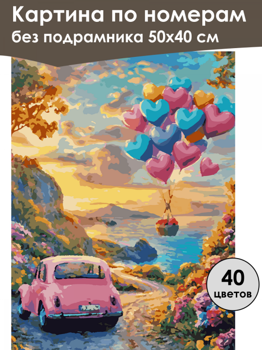Картина по номерам без подрамника, размер 50х40 см, произведена нами. Она включает 40 оттенков и 2682 контуров, что придаёт ей глубину цвета и плавные переходы. Картина выглядит более ярко и живо. В комплект входит глянцевый лак, которым можно покрыть работу по желанию. Краски имеют хорошую укрывистость, хватает двух проходов что бы закрасить символы на схеме. Так же они сохраняют текстуру мазков, не растекаясь и не разглаживаясь полностью на холсте. При покрытии глянцевым лаком создаётся эффект приближенный к масляной живописи. Краски упакованы герметично, что сохраняет их жидкими. Все необходимые инструменты для начала работы также входят в комплект. Мы не используем экосольвентные чернила, которые содержат свинец и могут быть вредны для здоровья. Наши картины напечатаны безопасными водными пигментными чернилами, обеспечивающими чёткое изображение и легко читаемые обозначения. Холст плотный, имеет мелкую зернистость, легко разглаживается и устойчив к сминанию. Картина поставляется в бурой коробке. Следует отметить, что картина без подрамника её нельзя натянуть на подрамник из-за узких краёв, она предназначена для оформления в рамочку. Яркая и мечтательная сцена: розовый автомобиль движется по извилистой дороге среди цветочной растительности, в небе над морем парит воздушный шар с множеством разноцветных сердцевидных шаров, окружающий пейзаж залит мягким светом заката, создавая атмосферу сказочной романтики.