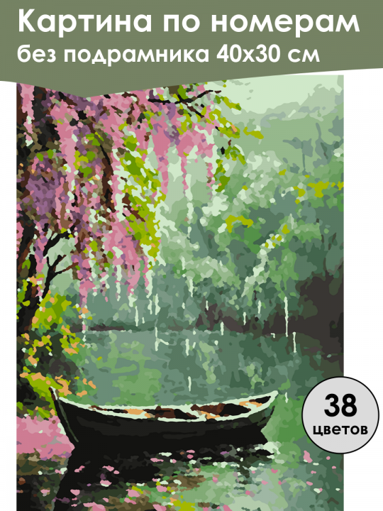 Картина по номерам без подрамника, размер 40х30 см, произведена нами. Она включает 40 оттенков и 2813 контуров, что придаёт ей глубину цвета и плавные переходы. Картина выглядит более ярко и живо. В комплект входит глянцевый лак, которым можно покрыть работу по желанию. Краски имеют хорошую укрывистость, хватает двух проходов что бы закрасить символы на схеме. Так же они сохраняют текстуру мазков, не растекаясь и не разглаживаясь полностью на холсте. При покрытии глянцевым лаком создаётся эффект приближенный к масляной живописи. Краски упакованы герметично, что сохраняет их жидкими. Все необходимые инструменты для начала работы также входят в комплект. Мы не используем экосольвентные чернила, которые содержат свинец и могут быть вредны для здоровья. Наши картины напечатаны безопасными водными пигментными чернилами, обеспечивающими чёткое изображение и легко читаемые обозначения. Холст плотный, имеет мелкую зернистость, легко разглаживается и устойчив к сминанию. Картина поставляется в бурой коробке. Следует отметить, что картина без подрамника её нельзя натянуть на подрамник из-за узких краёв, она предназначена для оформления в рамочку. Лодка покоится на зеркальной поверхности воды, окружённой густой растительностью, с ветвями деревьев, украшенными свисающими розовыми цветами, создавая атмосферу спокойствия и природной гармонии.