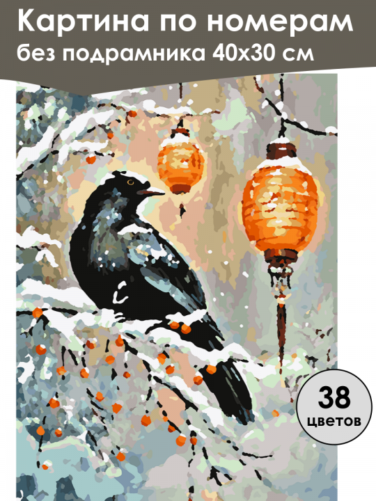 Картина по номерам без подрамника, размер 40х30 см, произведена нами. Она включает 40 оттенков и 2300 контуров, что придаёт ей глубину цвета и плавные переходы. Картина выглядит более ярко и живо. В комплект входит глянцевый лак, которым можно покрыть работу по желанию. Краски имеют хорошую укрывистость, хватает двух проходов что бы закрасить символы на схеме. Так же они сохраняют текстуру мазков, не растекаясь и не разглаживаясь полностью на холсте. При покрытии глянцевым лаком создаётся эффект приближенный к масляной живописи. Краски упакованы герметично, что сохраняет их жидкими. Все необходимые инструменты для начала работы также входят в комплект. Мы не используем экосольвентные чернила, которые содержат свинец и могут быть вредны для здоровья. Наши картины напечатаны безопасными водными пигментными чернилами, обеспечивающими чёткое изображение и легко читаемые обозначения. Холст плотный, имеет мелкую зернистость, легко разглаживается и устойчив к сминанию. Картина поставляется в бурой коробке. Следует отметить, что картина без подрамника её нельзя натянуть на подрамник из-за узких краёв, она предназначена для оформления в рамочку. Крупная чёрная птица сидит на заснеженной ветке, украшенной красными ягодами, рядом висят яркие оранжевые фонари, создающие тёплое свечение на фоне зимнего пейзажа.