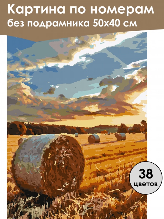 Картина по номерам без подрамника, размер 50х40 см, произведена нами. Она включает 40 оттенков и 2189 контуров, что придаёт ей глубину цвета и плавные переходы. Картина выглядит более ярко и живо. В комплект входит глянцевый лак, которым можно покрыть работу по желанию. Краски имеют хорошую укрывистость, хватает двух проходов что бы закрасить символы на схеме. Так же они сохраняют текстуру мазков, не растекаясь и не разглаживаясь полностью на холсте. При покрытии глянцевым лаком создаётся эффект приближенный к масляной живописи. Краски упакованы герметично, что сохраняет их жидкими. Все необходимые инструменты для начала работы также входят в комплект. Мы не используем экосольвентные чернила, которые содержат свинец и могут быть вредны для здоровья. Наши картины напечатаны безопасными водными пигментными чернилами, обеспечивающими чёткое изображение и легко читаемые обозначения. Холст плотный, имеет мелкую зернистость, легко разглаживается и устойчив к сминанию. Картина поставляется в бурой коробке. Следует отметить, что картина без подрамника её нельзя натянуть на подрамник из-за узких краёв, она предназначена для оформления в рамочку. Поле с тюками сена под ярким закатным небом, облака окрашены в теплые оттенки, создавая атмосферу покоя и уюта.