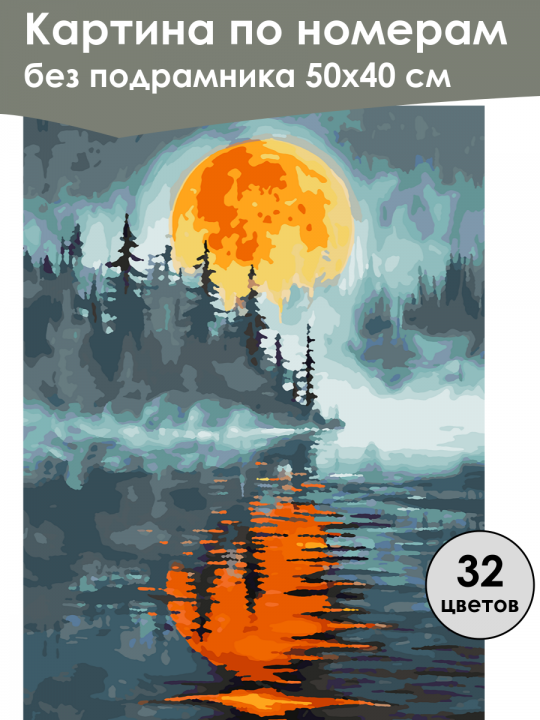 Картина по номерам без подрамника, размер 50х40 см, произведена нами. Она включает 40 оттенков и 1594 контуров, что придаёт ей глубину цвета и плавные переходы. Картина выглядит более ярко и живо. В комплект входит глянцевый лак, которым можно покрыть работу по желанию. Краски имеют хорошую укрывистость, хватает двух проходов что бы закрасить символы на схеме. Так же они сохраняют текстуру мазков, не растекаясь и не разглаживаясь полностью на холсте. При покрытии глянцевым лаком создаётся эффект приближенный к масляной живописи. Краски упакованы герметично, что сохраняет их жидкими. Все необходимые инструменты для начала работы также входят в комплект. Мы не используем экосольвентные чернила, которые содержат свинец и могут быть вредны для здоровья. Наши картины напечатаны безопасными водными пигментными чернилами, обеспечивающими чёткое изображение и легко читаемые обозначения. Холст плотный, имеет мелкую зернистость, легко разглаживается и устойчив к сминанию. Картина поставляется в бурой коробке. Следует отметить, что картина без подрамника её нельзя натянуть на подрамник из-за узких краёв, она предназначена для оформления в рамочку. Ярко-оранжевая луна на фоне пасмурного ночного неба, отражающуюся на поверхности спокойного водоёма, окружённого туманом и тёмными силуэтами елей.