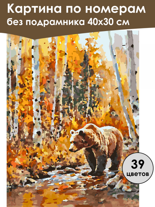 Картина по номерам без подрамника, размер 40х30 см, произведена нами. Она включает 40 оттенков и 3900 контуров, что придаёт ей глубину цвета и плавные переходы. Картина выглядит более ярко и живо. В комплект входит глянцевый лак, которым можно покрыть работу по желанию. Краски имеют хорошую укрывистость, хватает двух проходов что бы закрасить символы на схеме. Так же они сохраняют текстуру мазков, не растекаясь и не разглаживаясь полностью на холсте. При покрытии глянцевым лаком создаётся эффект приближенный к масляной живописи. Краски упакованы герметично, что сохраняет их жидкими. Все необходимые инструменты для начала работы также входят в комплект. Мы не используем экосольвентные чернила, которые содержат свинец и могут быть вредны для здоровья. Наши картины напечатаны безопасными водными пигментными чернилами, обеспечивающими чёткое изображение и легко читаемые обозначения. Холст плотный, имеет мелкую зернистость, легко разглаживается и устойчив к сминанию. Картина поставляется в бурой коробке. Следует отметить, что картина без подрамника её нельзя натянуть на подрамник из-за узких краёв, она предназначена для оформления в рамочку. Медведь, прогуливающийся вдоль ручья в лесу, окружённом осенними деревьями с жёлтыми и оранжевыми листьями, создавая яркий и тёплый пейзаж.