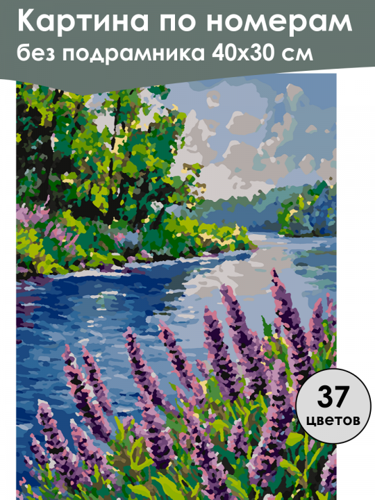 Картина по номерам без подрамника, размер 40х30 см, произведена нами. Она включает 40 оттенков и 3423 контуров, что придаёт ей глубину цвета и плавные переходы. Картина выглядит более ярко и живо. В комплект входит глянцевый лак, которым можно покрыть работу по желанию. Краски имеют хорошую укрывистость, хватает двух проходов что бы закрасить символы на схеме. Так же они сохраняют текстуру мазков, не растекаясь и не разглаживаясь полностью на холсте. При покрытии глянцевым лаком создаётся эффект приближенный к масляной живописи. Краски упакованы герметично, что сохраняет их жидкими. Все необходимые инструменты для начала работы также входят в комплект. Мы не используем экосольвентные чернила, которые содержат свинец и могут быть вредны для здоровья. Наши картины напечатаны безопасными водными пигментными чернилами, обеспечивающими чёткое изображение и легко читаемые обозначения. Холст плотный, имеет мелкую зернистость, легко разглаживается и устойчив к сминанию. Картина поставляется в бурой коробке. Следует отметить, что картина без подрамника её нельзя натянуть на подрамник из-за узких краёв, она предназначена для оформления в рамочку. Пейзаж с рекой, окружённой густыми лесами, солнечное небо с облаками отражается в воде, на переднем плане справа расположены яркие фиолетовые цветы.