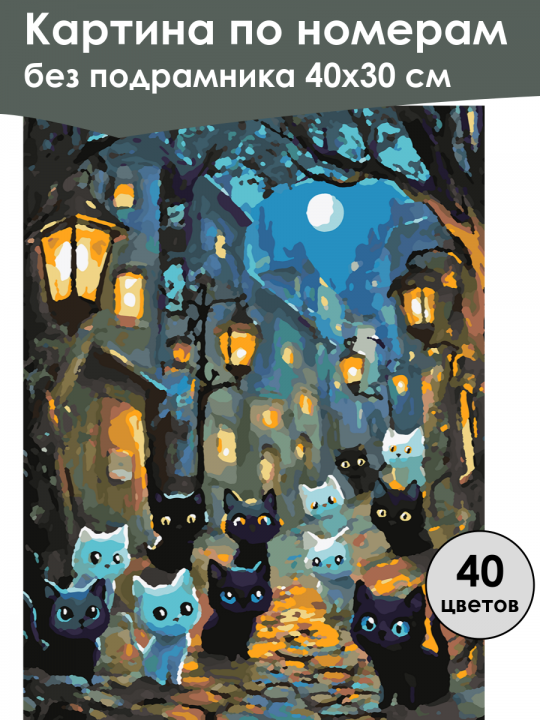 Картина по номерам без подрамника, размер 40х30 см, произведена нами. Она включает 40 оттенков и 2996 контуров, что придаёт ей глубину цвета и плавные переходы. Картина выглядит более ярко и живо. В комплект входит глянцевый лак, которым можно покрыть работу по желанию. Краски имеют хорошую укрывистость, хватает двух проходов что бы закрасить символы на схеме. Так же они сохраняют текстуру мазков, не растекаясь и не разглаживаясь полностью на холсте. При покрытии глянцевым лаком создаётся эффект приближенный к масляной живописи. Краски упакованы герметично, что сохраняет их жидкими. Все необходимые инструменты для начала работы также входят в комплект. Мы не используем экосольвентные чернила, которые содержат свинец и могут быть вредны для здоровья. Наши картины напечатаны безопасными водными пигментными чернилами, обеспечивающими чёткое изображение и легко читаемые обозначения. Холст плотный, имеет мелкую зернистость, легко разглаживается и устойчив к сминанию. Картина поставляется в бурой коробке. Следует отметить, что картина без подрамника её нельзя натянуть на подрамник из-за узких краёв, она предназначена для оформления в рамочку. Волшебная ночная сцена, где группа милых черных и белых котят с большими глазами собралась на старинной мощеной улице, освещенной фонарями, под яркой полной луной, окруженной деревьями и старинными зданиями.