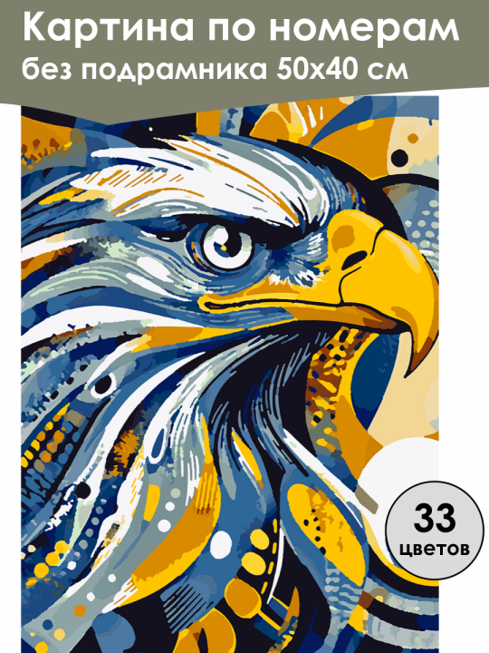 Картина по номерам без подрамника, размер 50х40 см, произведена нами. Она включает 40 оттенков и 1664 контуров, что придаёт ей глубину цвета и плавные переходы. Картина выглядит более ярко и живо. В комплект входит глянцевый лак, которым можно покрыть работу по желанию. Краски имеют хорошую укрывистость, хватает двух проходов что бы закрасить символы на схеме. Так же они сохраняют текстуру мазков, не растекаясь и не разглаживаясь полностью на холсте. При покрытии глянцевым лаком создаётся эффект приближенный к масляной живописи. Краски упакованы герметично, что сохраняет их жидкими. Все необходимые инструменты для начала работы также входят в комплект. Мы не используем экосольвентные чернила, которые содержат свинец и могут быть вредны для здоровья. Наши картины напечатаны безопасными водными пигментными чернилами, обеспечивающими чёткое изображение и легко читаемые обозначения. Холст плотный, имеет мелкую зернистость, легко разглаживается и устойчив к сминанию. Картина поставляется в бурой коробке. Следует отметить, что картина без подрамника её нельзя натянуть на подрамник из-за узких краёв, она предназначена для оформления в рамочку. Голова орла, выполненная в абстрактной манере, с использованием насыщенных оттенков синего, белого, жёлтого и оранжевого цветов, создающих динамичное сочетание.