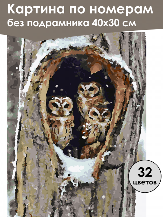 Картина по номерам без подрамника, размер 40х30 см, произведена нами. Она включает 40 оттенков и 3662 контуров, что придаёт ей глубину цвета и плавные переходы. Картина выглядит более ярко и живо. В комплект входит глянцевый лак, которым можно покрыть работу по желанию. Краски имеют хорошую укрывистость, хватает двух проходов что бы закрасить символы на схеме. Так же они сохраняют текстуру мазков, не растекаясь и не разглаживаясь полностью на холсте. При покрытии глянцевым лаком создаётся эффект приближенный к масляной живописи. Краски упакованы герметично, что сохраняет их жидкими. Все необходимые инструменты для начала работы также входят в комплект. Мы не используем экосольвентные чернила, которые содержат свинец и могут быть вредны для здоровья. Наши картины напечатаны безопасными водными пигментными чернилами, обеспечивающими чёткое изображение и легко читаемые обозначения. Холст плотный, имеет мелкую зернистость, легко разглаживается и устойчив к сминанию. Картина поставляется в бурой коробке. Следует отметить, что картина без подрамника её нельзя натянуть на подрамник из-за узких краёв, она предназначена для оформления в рамочку. Три совы уютно устроились в дупле дерева, покрытого снегом, их крупные выразительные глаза пристально смотрят наружу, оттенки древесной коры и белого снега создают живописную и умиротворяющую зимнюю сцену.