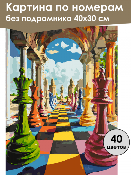Картина по номерам без подрамника, размер 40х30 см, произведена нами. Она включает 40 оттенков и 1861 контуров, что придаёт ей глубину цвета и плавные переходы. Картина выглядит более ярко и живо. В комплект входит глянцевый лак, которым можно покрыть работу по желанию. Краски имеют хорошую укрывистость, хватает двух проходов что бы закрасить символы на схеме. Так же они сохраняют текстуру мазков, не растекаясь и не разглаживаясь полностью на холсте. При покрытии глянцевым лаком создаётся эффект приближенный к масляной живописи. Краски упакованы герметично, что сохраняет их жидкими. Все необходимые инструменты для начала работы также входят в комплект. Мы не используем экосольвентные чернила, которые содержат свинец и могут быть вредны для здоровья. Наши картины напечатаны безопасными водными пигментными чернилами, обеспечивающими чёткое изображение и легко читаемые обозначения. Холст плотный, имеет мелкую зернистость, легко разглаживается и устойчив к сминанию. Картина поставляется в бурой коробке. Следует отметить, что картина без подрамника её нельзя натянуть на подрамник из-за узких краёв, она предназначена для оформления в рамочку. Абстракция с шахматными фигурами в виде гигантских пешек, выстроенных вдоль длинного коридора с колоннами и арочными сводами, пол которого покрыт квадратами чередующихся цветов, создавая впечатление глубины и перспективы под ясным голубым небом с белыми облаками.