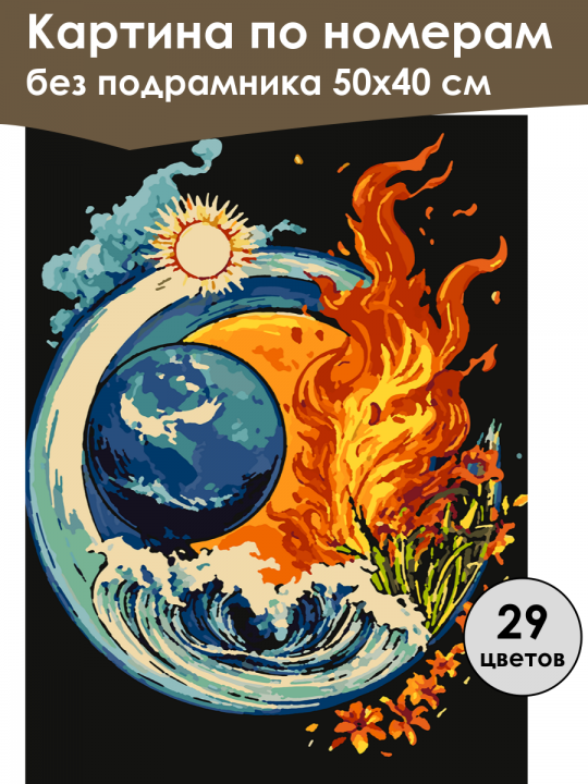 Картина по номерам без подрамника, размер 50х40 см, произведена нами. Она включает 40 оттенков и 1489 контуров, что придаёт ей глубину цвета и плавные переходы. Картина выглядит более ярко и живо. В комплект входит глянцевый лак, которым можно покрыть работу по желанию. Краски имеют хорошую укрывистость, хватает двух проходов что бы закрасить символы на схеме. Так же они сохраняют текстуру мазков, не растекаясь и не разглаживаясь полностью на холсте. При покрытии глянцевым лаком создаётся эффект приближенный к масляной живописи. Краски упакованы герметично, что сохраняет их жидкими. Все необходимые инструменты для начала работы также входят в комплект. Мы не используем экосольвентные чернила, которые содержат свинец и могут быть вредны для здоровья. Наши картины напечатаны безопасными водными пигментными чернилами, обеспечивающими чёткое изображение и легко читаемые обозначения. Холст плотный, имеет мелкую зернистость, легко разглаживается и устойчив к сминанию. Картина поставляется в бурой коробке. Следует отметить, что картина без подрамника её нельзя натянуть на подрамник из-за узких краёв, она предназначена для оформления в рамочку. Символическая интерпретация природных элементов в круге: огонь представлен языками пламени справа, вода отображена в виде волн снизу, воздух - облаками и солнцем слева наверху, а земля изображена в центре шаром с зеленью и цветами.