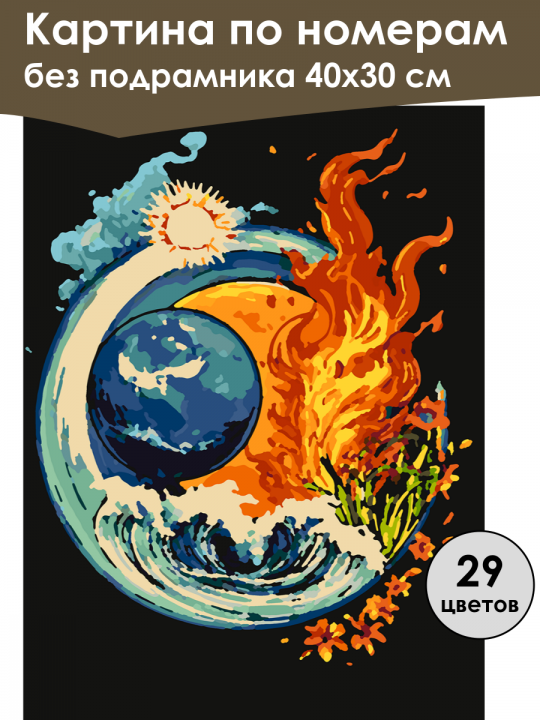 Картина по номерам без подрамника, размер 40х30 см, произведена нами. Она включает 40 оттенков и 1134 контуров, что придаёт ей глубину цвета и плавные переходы. Картина выглядит более ярко и живо. В комплект входит глянцевый лак, которым можно покрыть работу по желанию. Краски имеют хорошую укрывистость, хватает двух проходов что бы закрасить символы на схеме. Так же они сохраняют текстуру мазков, не растекаясь и не разглаживаясь полностью на холсте. При покрытии глянцевым лаком создаётся эффект приближенный к масляной живописи. Краски упакованы герметично, что сохраняет их жидкими. Все необходимые инструменты для начала работы также входят в комплект. Мы не используем экосольвентные чернила, которые содержат свинец и могут быть вредны для здоровья. Наши картины напечатаны безопасными водными пигментными чернилами, обеспечивающими чёткое изображение и легко читаемые обозначения. Холст плотный, имеет мелкую зернистость, легко разглаживается и устойчив к сминанию. Картина поставляется в бурой коробке. Следует отметить, что картина без подрамника её нельзя натянуть на подрамник из-за узких краёв, она предназначена для оформления в рамочку. Символическая интерпретация природных элементов в круге: огонь представлен языками пламени справа, вода отображена в виде волн снизу, воздух - облаками и солнцем слева наверху, а земля изображена в центре шаром с зеленью и цветами.
