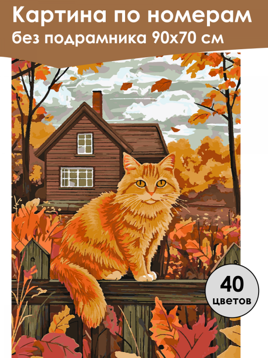 Картина по номерам без подрамника, размер 90х70 см, произведена нами. Она включает 40 оттенков и 4797 контуров, что придаёт ей глубину цвета и плавные переходы. Картина выглядит более ярко и живо. В комплект входит глянцевый лак, которым можно покрыть работу по желанию. Краски имеют хорошую укрывистость, хватает двух проходов что бы закрасить символы на схеме. Так же они сохраняют текстуру мазков, не растекаясь и не разглаживаясь полностью на холсте. При покрытии глянцевым лаком создаётся эффект приближенный к масляной живописи. Краски упакованы герметично, что сохраняет их жидкими. Все необходимые инструменты для начала работы также входят в комплект. Мы не используем экосольвентные чернила, которые содержат свинец и могут быть вредны для здоровья. Наши картины напечатаны безопасными водными пигментными чернилами, обеспечивающими чёткое изображение и легко читаемые обозначения. Холст плотный, имеет мелкую зернистость, легко разглаживается и устойчив к сминанию. Картина поставляется в защищённом буром тубусе. Следует отметить, что картина без подрамника её нельзя натянуть на подрамник из-за узких краёв, она предназначена для оформления в рамочку. Оранжевый кот сидит на деревянном заборе, обрамлённом осенними деревьями с яркими листьями, на фоне стоит деревянный дом с двумя окнами, а небо покрыто облаками.