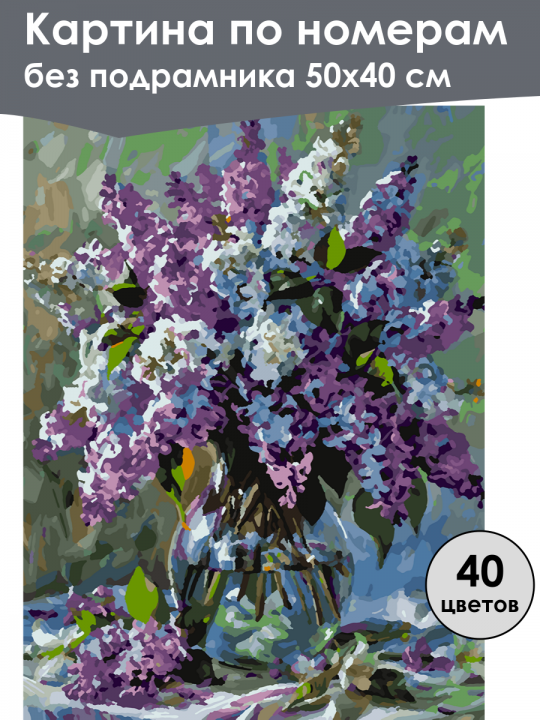 Картина по номерам без подрамника, размер 50х40 см, произведена нами. Она включает 40 оттенков и 3413 контуров, что придаёт ей глубину цвета и плавные переходы. Картина выглядит более ярко и живо. В комплект входит глянцевый лак, которым можно покрыть работу по желанию. Краски имеют хорошую укрывистость, хватает двух проходов что бы закрасить символы на схеме. Так же они сохраняют текстуру мазков, не растекаясь и не разглаживаясь полностью на холсте. При покрытии глянцевым лаком создаётся эффект приближенный к масляной живописи. Краски упакованы герметично, что сохраняет их жидкими. Все необходимые инструменты для начала работы также входят в комплект. Мы не используем экосольвентные чернила, которые содержат свинец и могут быть вредны для здоровья. Наши картины напечатаны безопасными водными пигментными чернилами, обеспечивающими чёткое изображение и легко читаемые обозначения. Холст плотный, имеет мелкую зернистость, легко разглаживается и устойчив к сминанию. Картина поставляется в бурой коробке. Следует отметить, что картина без подрамника её нельзя натянуть на подрамник из-за узких краёв, она предназначена для оформления в рамочку. Художественное изображение букета сирени в вазе, выполненное в стиле цифровой живописи; цветы сирени обильно и живописно размещены в прозрачной вазе, окружённой насыщенными оттенками зелени и фиолетового, создающими гармоничную и приятную цветовую палитру.