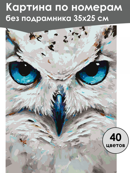 Картина по номерам без подрамника, размер 35х25 см, произведена нами. Она включает 40 оттенков и 1948 контуров, что придаёт ей глубину цвета и плавные переходы. Картина выглядит более ярко и живо. В комплект входит глянцевый лак, которым можно покрыть работу по желанию. Краски качественные, имеют хорошую укрывистость, хватает двух проходов что бы закрасить символы на схеме. Они упакованы герметично, что сохраняет их жидкими. Все необходимые инструменты для начала работы также включены в комплект. Мы не используем экосольвентные чернила, которые содержат свинец и могут быть вредны для здоровья. Наши картины напечатаны безопасными водными пигментными чернилами, обеспечивающими чёткое изображение и легко читаемые обозначения. Холст плотный, имеет мелкую зернистость, легко разглаживается и устойчив к сминанию. Картина поставляется в защищённой бурой коробке. Следует отметить, что картина без подрамника её нельзя натянуть на подрамник из-за узких краёв, она предназначена для оформления в рамочку. Сова крупным планом, с ярко-голубыми глазами, фокус сосредоточен на остром клюве и выразительных глазах, с преобладанием серых и белых оттенков оперения и легкими вкраплениями коричневого цвета.