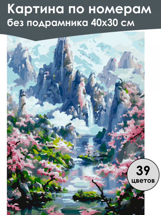 Картина по номерам без подрамника, размер 40х30 см, произведена нами. Она включает 40 оттенков и 3036 контуров, что придаёт ей глубину цвета и плавные переходы. Картина выглядит более ярко и живо. В комплект входит глянцевый лак, которым можно покрыть работу по желанию. Краски имеют хорошую укрывистость, хватает двух проходов что бы закрасить символы на схеме. Так же они сохраняют текстуру мазков, не растекаясь и не разглаживаясь полностью на холсте. При покрытии глянцевым лаком создаётся эффект приближенный к масляной живописи. Краски упакованы герметично, что сохраняет их жидкими. Все необходимые инструменты для начала работы также входят в комплект. Мы не используем экосольвентные чернила, которые содержат свинец и могут быть вредны для здоровья. Наши картины напечатаны безопасными водными пигментными чернилами, обеспечивающими чёткое изображение и легко читаемые обозначения. Холст плотный, имеет мелкую зернистость, легко разглаживается и устойчив к сминанию. Картина поставляется в бурой коробке. Следует отметить, что картина без подрамника её нельзя натянуть на подрамник из-за узких краёв, она предназначена для оформления в рамочку. Живописный пейзаж с высокими величественными горами, окружёнными розовыми и белыми облаками, на переднем плане течёт река, обрамлённая пышными цветущими деревьями, создающими атмосферу спокойствия и гармонии.