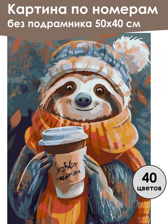 Картина по номерам без подрамника, размер 50х40 см, произведена нами. Она включает 40 оттенков и 2035 контуров, что придаёт ей глубину цвета и плавные переходы. Картина выглядит более ярко и живо. В комплект входит глянцевый лак, которым можно покрыть работу по желанию. Краски имеют хорошую укрывистость, хватает двух проходов что бы закрасить символы на схеме. Так же они сохраняют текстуру мазков, не растекаясь и не разглаживаясь полностью на холсте. При покрытии глянцевым лаком создаётся эффект приближенный к масляной живописи. Краски упакованы герметично, что сохраняет их жидкими. Все необходимые инструменты для начала работы также входят в комплект. Мы не используем экосольвентные чернила, которые содержат свинец и могут быть вредны для здоровья. Наши картины напечатаны безопасными водными пигментными чернилами, обеспечивающими чёткое изображение и легко читаемые обозначения. Холст плотный, имеет мелкую зернистость, легко разглаживается и устойчив к сминанию. Картина поставляется в бурой коробке. Следует отметить, что картина без подрамника её нельзя натянуть на подрамник из-за узких краёв, она предназначена для оформления в рамочку. Мультяшный ленивец с улыбкой, держащий одноразовый стаканчик с напитком; он одет в оранжевый шарф и полосатую шапку с помпоном, на фоне тёплых осенних листьев.