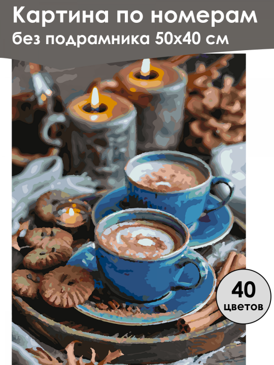 Картина по номерам без подрамника, размер 50х40 см, произведена нами. Она включает 40 оттенков и 2606 контуров, что придаёт ей глубину цвета и плавные переходы. Картина выглядит более ярко и живо. В комплект входит глянцевый лак, которым можно покрыть работу по желанию. Краски имеют хорошую укрывистость, хватает двух проходов что бы закрасить символы на схеме. Так же они сохраняют текстуру мазков, не растекаясь и не разглаживаясь полностью на холсте. При покрытии глянцевым лаком создаётся эффект приближенный к масляной живописи. Краски упакованы герметично, что сохраняет их жидкими. Все необходимые инструменты для начала работы также входят в комплект. Мы не используем экосольвентные чернила, которые содержат свинец и могут быть вредны для здоровья. Наши картины напечатаны безопасными водными пигментными чернилами, обеспечивающими чёткое изображение и легко читаемые обозначения. Холст плотный, имеет мелкую зернистость, легко разглаживается и устойчив к сминанию. Картина поставляется в бурой коробке. Следует отметить, что картина без подрамника её нельзя натянуть на подрамник из-за узких краёв, она предназначена для оформления в рамочку. Уютная композиция с двумя синими чашками кофе с пенкой на блюдечках, окруженными печеньем и корицей на деревянном подносе; в фоновом освещении две зажжённые свечи создают тёплую атмосферу.
